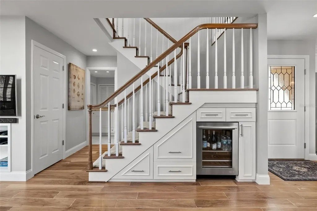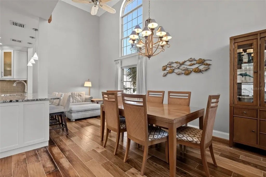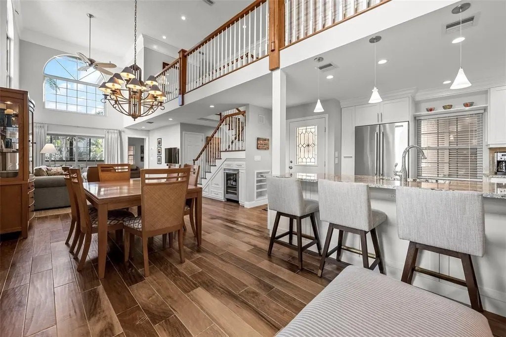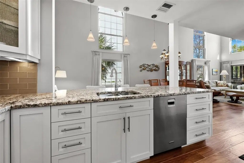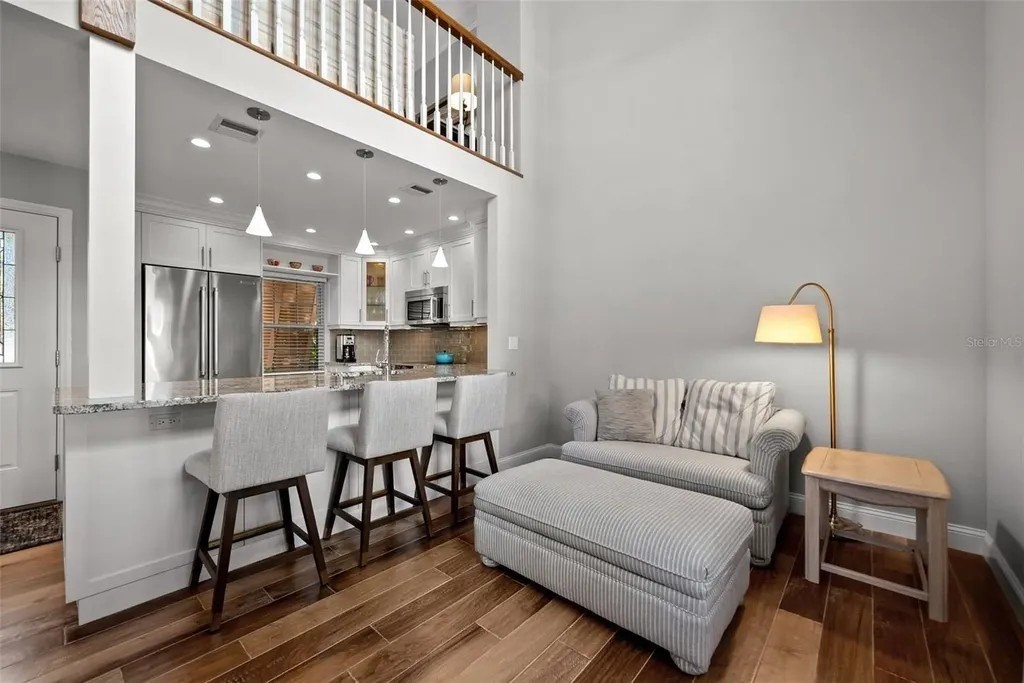 Tucked within a charming Gulf-side community of just 27 residences, this unique and rarely available townhouse on Siesta Key is in model condition and offers private access to one of the most celebrated beaches in the country. With 1,760 square feet of living space, the home features soaring two-story ceilings and abundant natural light throughout the main living areas. Head upstairs on the grand staircase to an additional bedroom plus a versatile loft space-currently used as a TV room and office-which could easily function as a third bedroom. The primary suite is conveniently located on the first floor and opens to a private enclosed sitting area. An updated kitchen with wood and glass cabinetry, natural stone countertops, stainless steel appliances, a spacious island flows into a casual dining area and living space, all finished with engineered hardwood floors, crown molding, and a neutral color palette. Two updated full bathrooms serve both levels, and laundry is located inside on the main floor. Additional features include built-in beverage refrigeration, hurricane shutters, and dedicated closets. Enjoy the private entry and an unheard of oversized garage with space for three vehicles adding loads of additional storage and convenience. The amount of storage is like living in a single family home. The community is primarily owner-occupied, with limited rentals, and welcomes large pets. Recent association improvements include new garage doors, exterior paint, landscaping, privacy fencing and more making this community feel like new. Steps from the white sands of Siesta Key, community pool, and close to shopping and dining. This move-in ready home invites you to settle into the ease of coastal living.